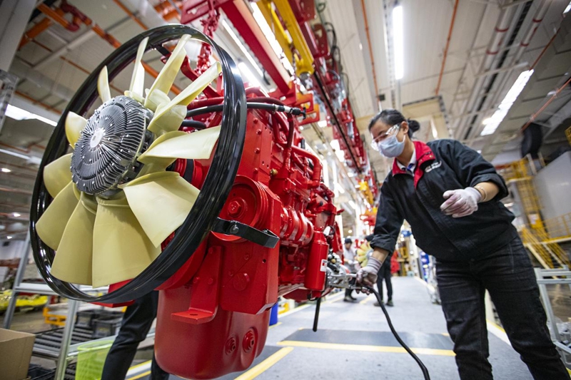 西安康明斯发动机有限公司工厂生产线上,员工在进行发动机装配作业。西安经开区供图