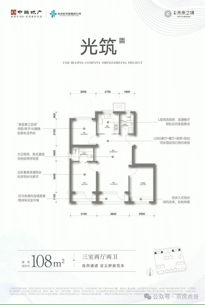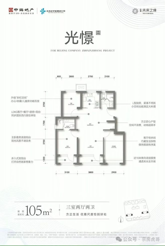 105平米南向三面宽的三居,是市面上最主流的三居设计。南向客厅面宽3.8米,主卧面宽3.1米,两个功能区都有阳台的赠送。次卧就是飘窗的赠送。