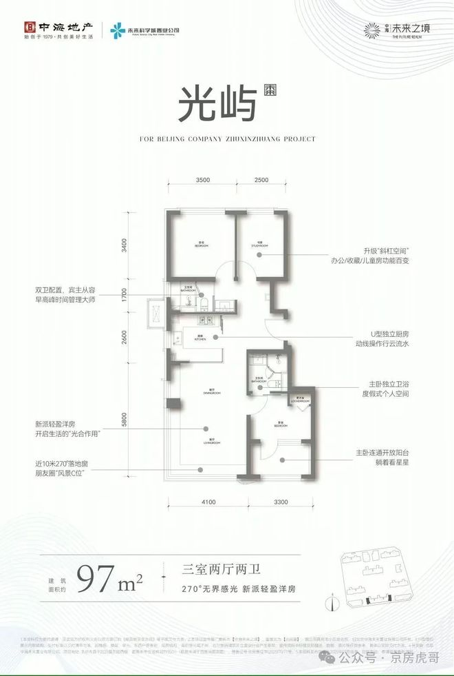 97平米南向两面宽的三居设计,客厅270°拐角飘窗设计,客厅南向面宽4.1米,主卧面宽3.3米,有阳台的赠送。厨房是开放式设计,餐厅也有独立的采光,且有飘窗的赠送。