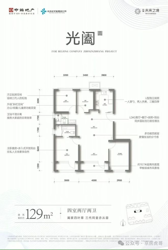 129平米是四居设计,南向三面宽,客厅的面宽在4.3米,主卧面宽在3.5米,客厅和主卧都是阳台的赠送。
